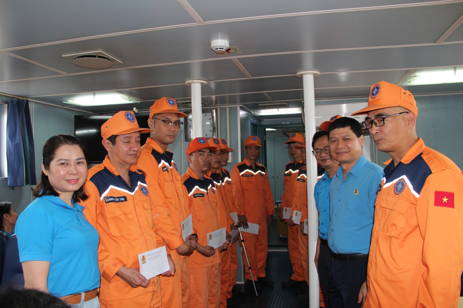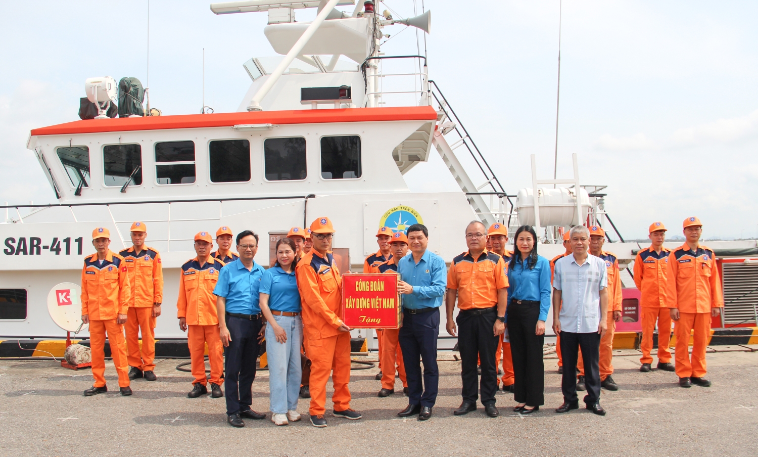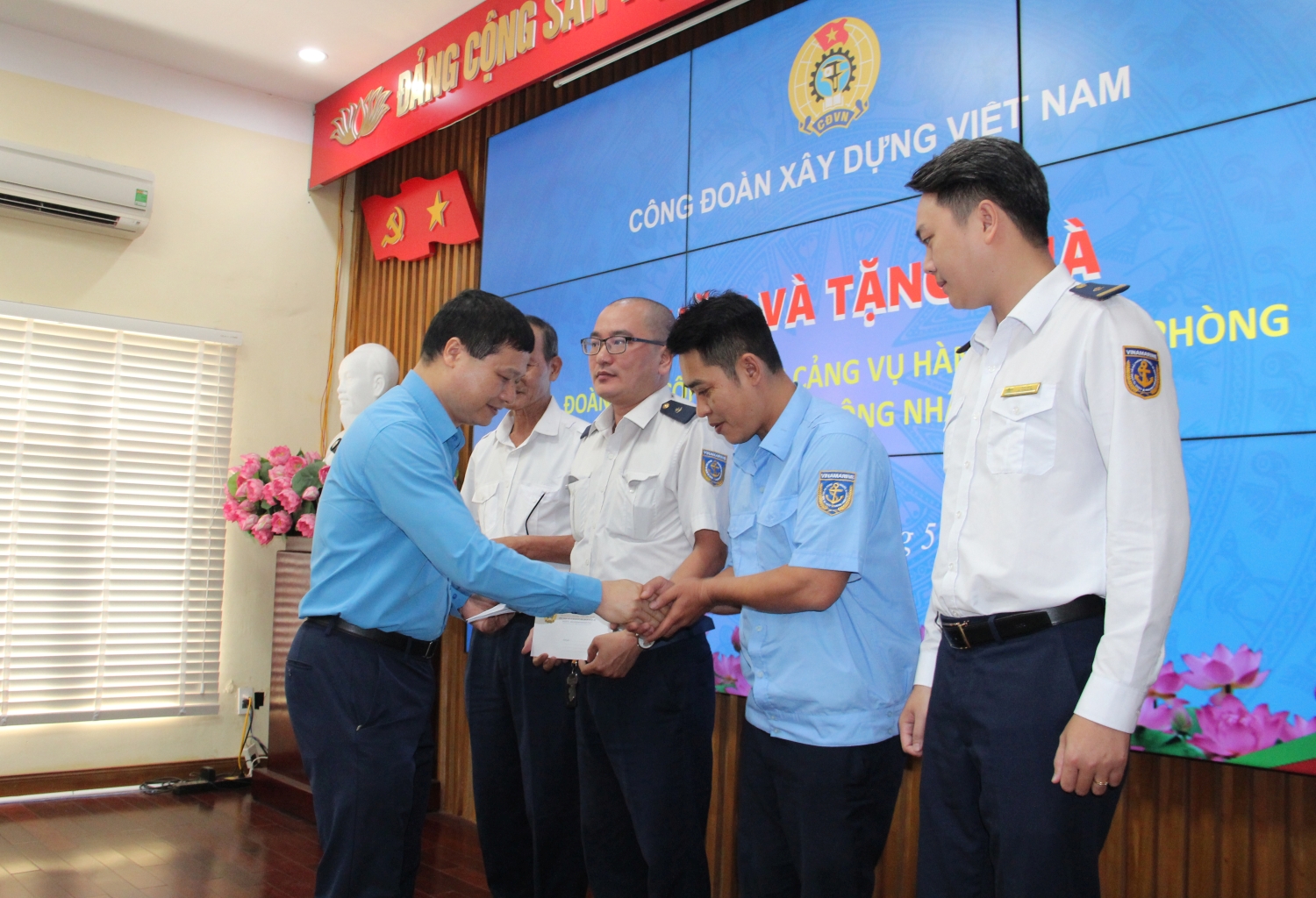 Đồng chí Nguyễn Thanh Tùng, Phó Chủ tịch Thường trực Công đoàn Xây dựng Việt Nam trao quà tới đoàn viên, người lao động Trung tâm Phối hợp tìm kiếm cứu nạn Hàng hải Khu vực I, Tàu Công vụ Cảng vụ Hàng hải Hải Phòng