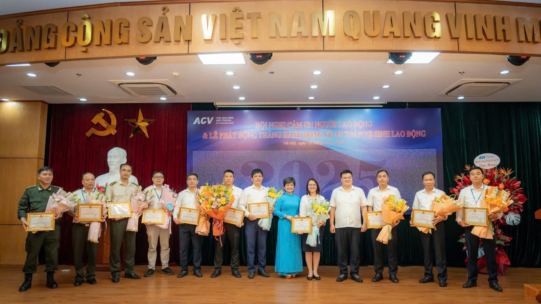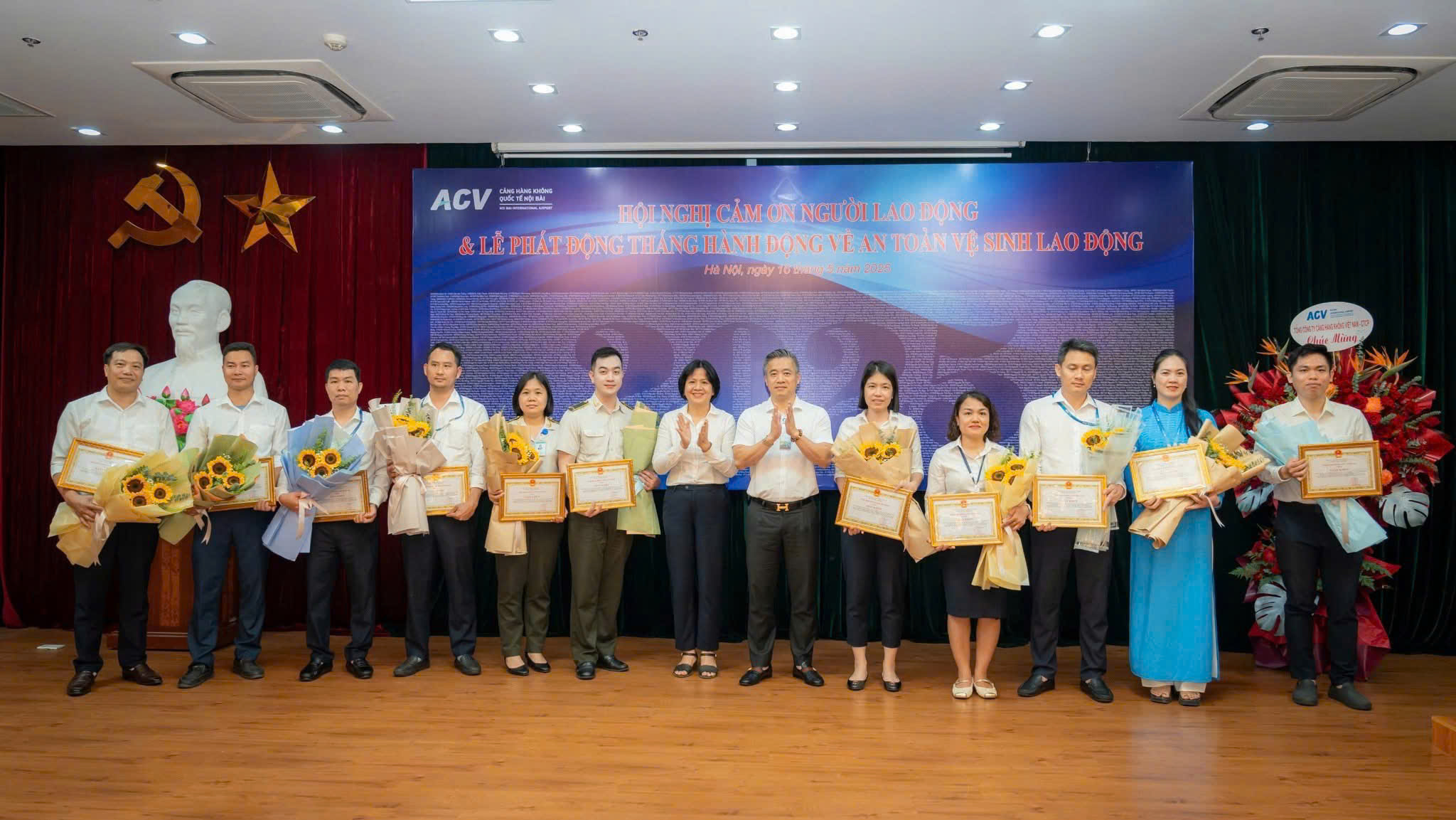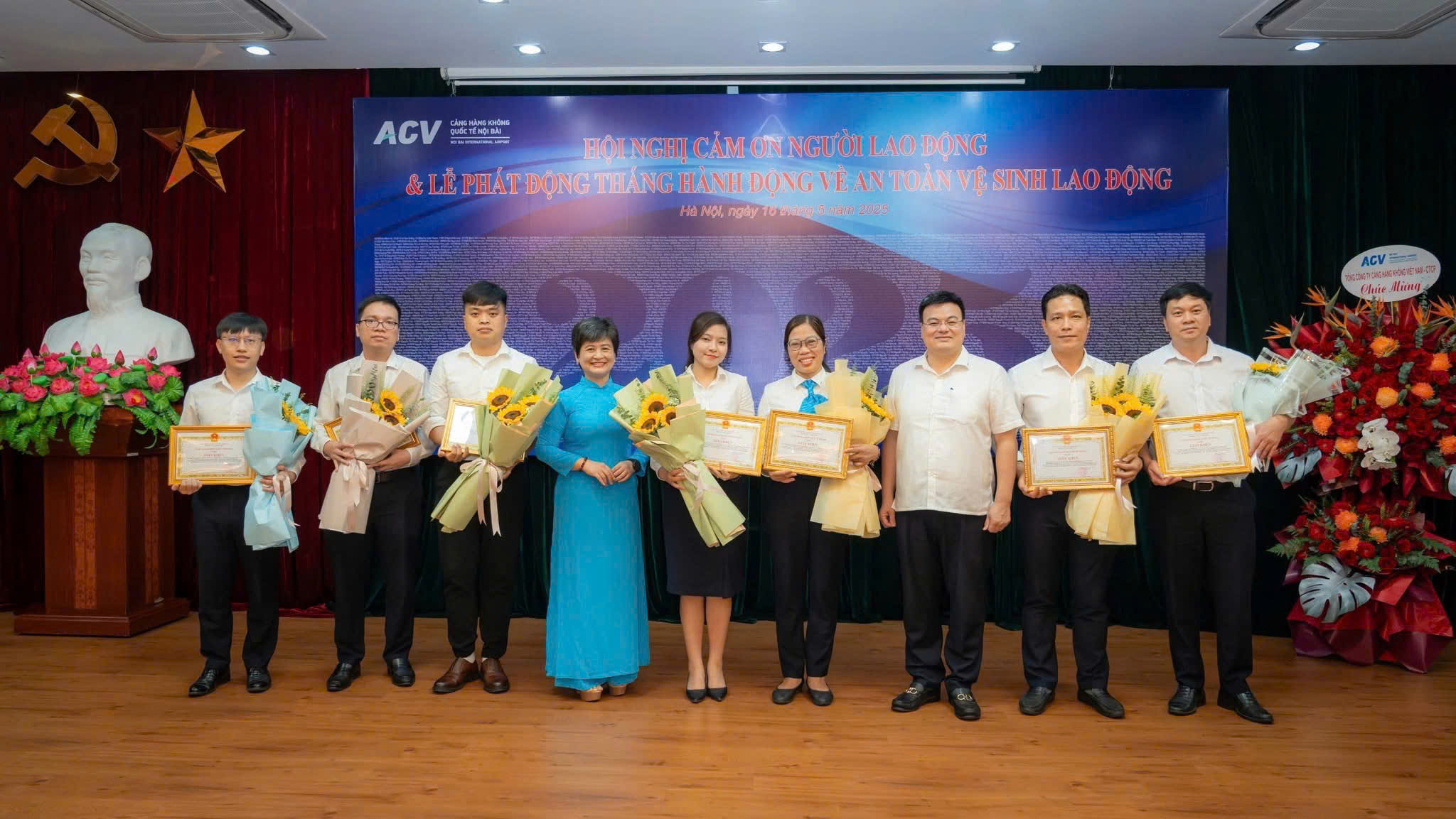 Sáng 16/5, hội trường Cảng HKQT Nội Bài rực rỡ sắc hoa và bằng khen trong sự kiện – Hội nghị Cảm ơn Người lao động và Lễ phát động Tháng hành động về An toàn vệ sinh lao động năm 2025.