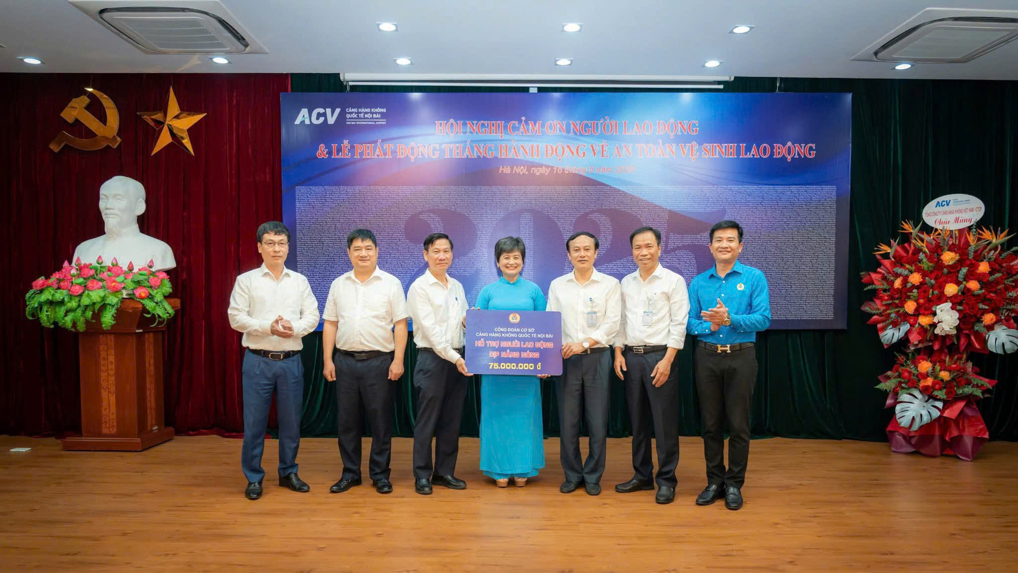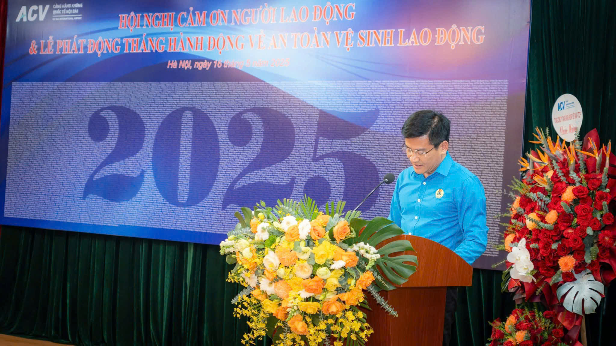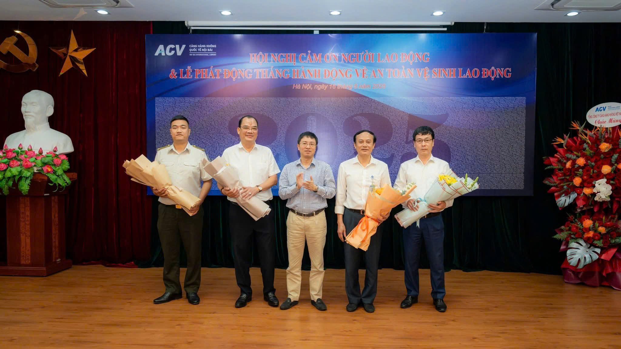 Sáng 16/5, hội trường Cảng HKQT Nội Bài rực rỡ sắc hoa và bằng khen trong sự kiện – Hội nghị Cảm ơn Người lao động và Lễ phát động Tháng hành động về An toàn vệ sinh lao động năm 2025.