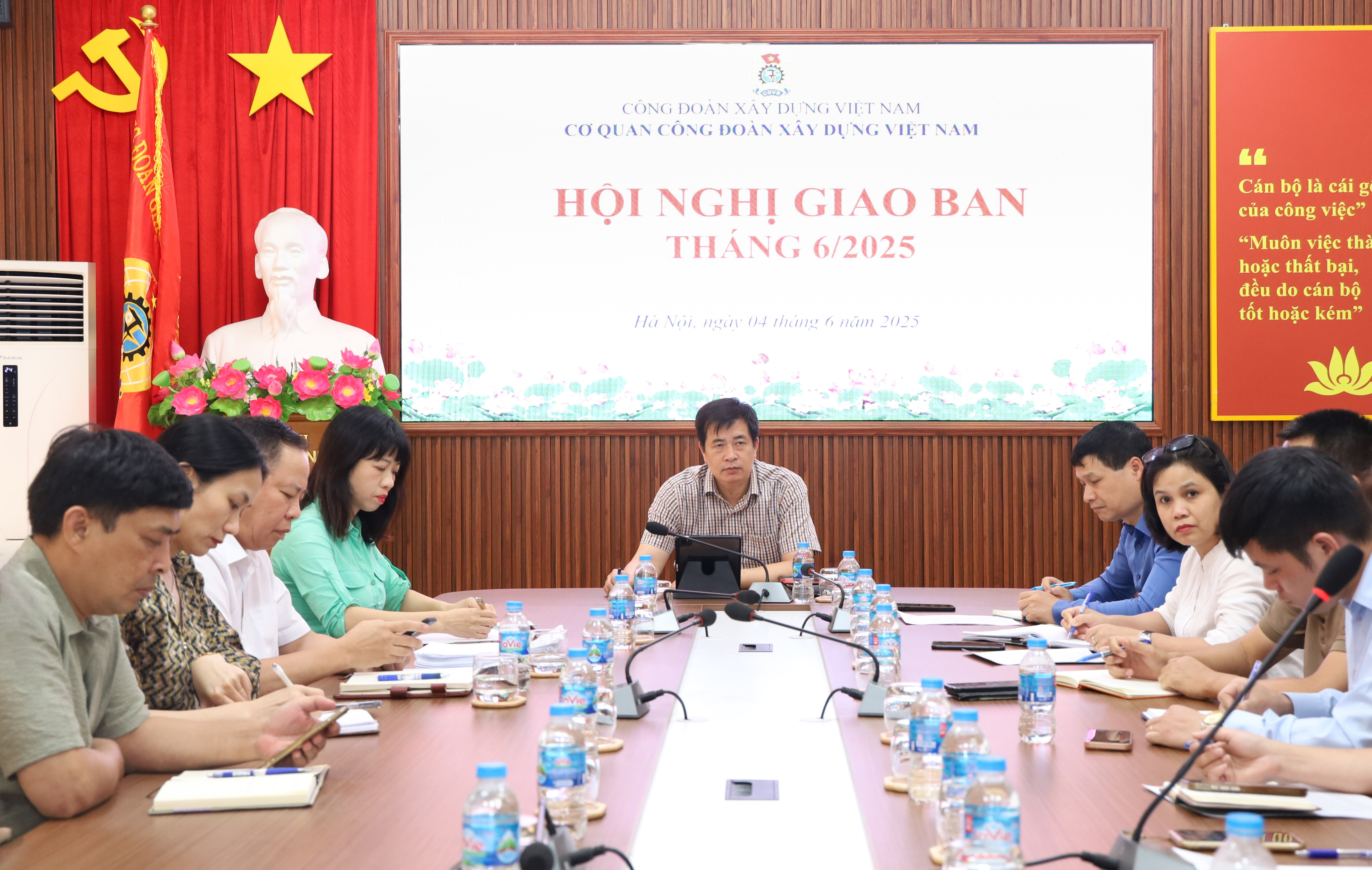 Đồng chí Phạm Hoài Phương, Ủy viên Ban Chấp hành Tổng Liên đoàn Lao động Việt Nam, Chủ tịch Công đoàn Xây dựng Việt Nam và đồng chí Lê Hồng Phong, Chủ tịch Công đoàn Cơ quan tặng hoa chúc mừng các đồng chí trong Cơ quan có ngày sinh nhật trong tháng 6/2025.