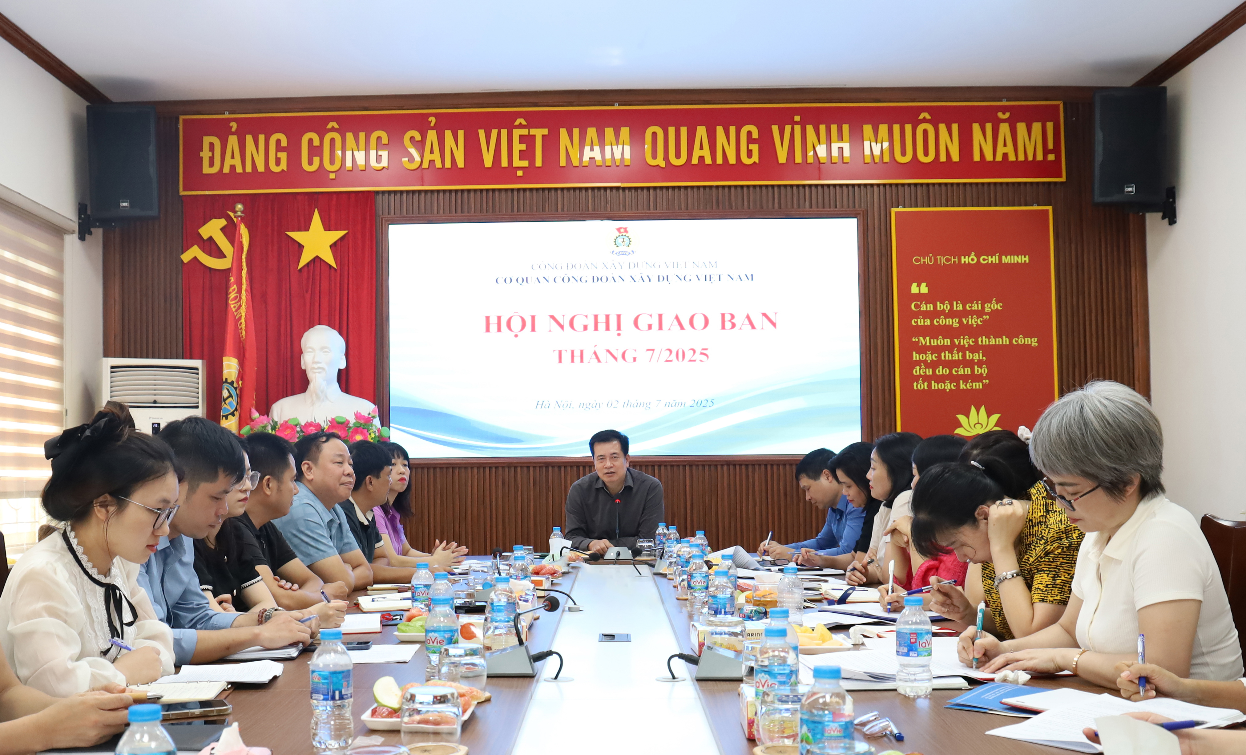 Tại Hội nghị giao ban, đồng chí Phạm Hoài Phương, Chủ tịch Công đoàn Xây dựng Việt Nam, Thủ trưởng Cơ quan đã đánh giá kết quả thực hiện nhiệm vụ công tác của các Ban trong tháng 6/2025. Các nhiệm vụ trong tháng đã được triển khai đúng tiến độ, đảm bảo chất lượng, góp phần hoàn thành tốt chức năng, nhiệm vụ chung của Cơ quan. Đồng thời, đồng chí cũng trực tiếp chỉ đạo tháo gỡ những khó khăn, vướng mắc trong tổ chức thực hiện nhiệm vụ của các Ban, tạo điều kiện thuận lợi để các Ban hoàn thành tốt nhiệm vụ được giao.
