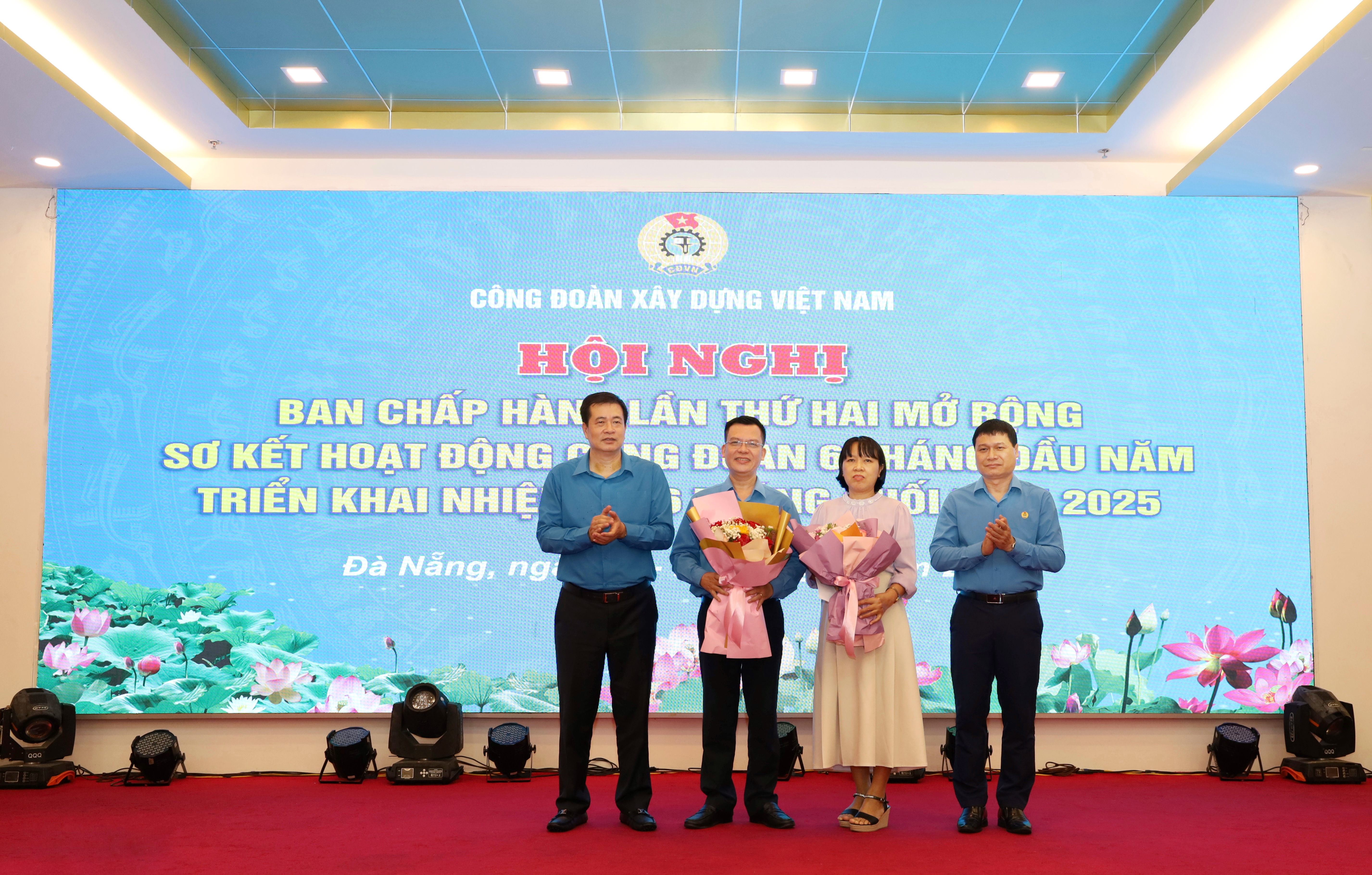 Đồng chí Nguyễn Xuân Hùng, Phó Chủ tịch Tổng Liên đoàn lao động Việt Nam và đồng chí Phạm Hoài Phương, Ủy viên Ban Chấp hành Tổng Liên đoàn Lao động Việt Nam, Ủy viên Ban Chấp hành Đảng bộ Bộ Xây dựng, Chủ tịch Công đoàn Xây dựng Việt Nam tặng hoa tri ân, chia tay các đồng chí nguyên Ủy viên Ban Chấp hành, Ủy viên Ủy ban Kiểm tra Công đoàn Xây dựng Việt Nam
