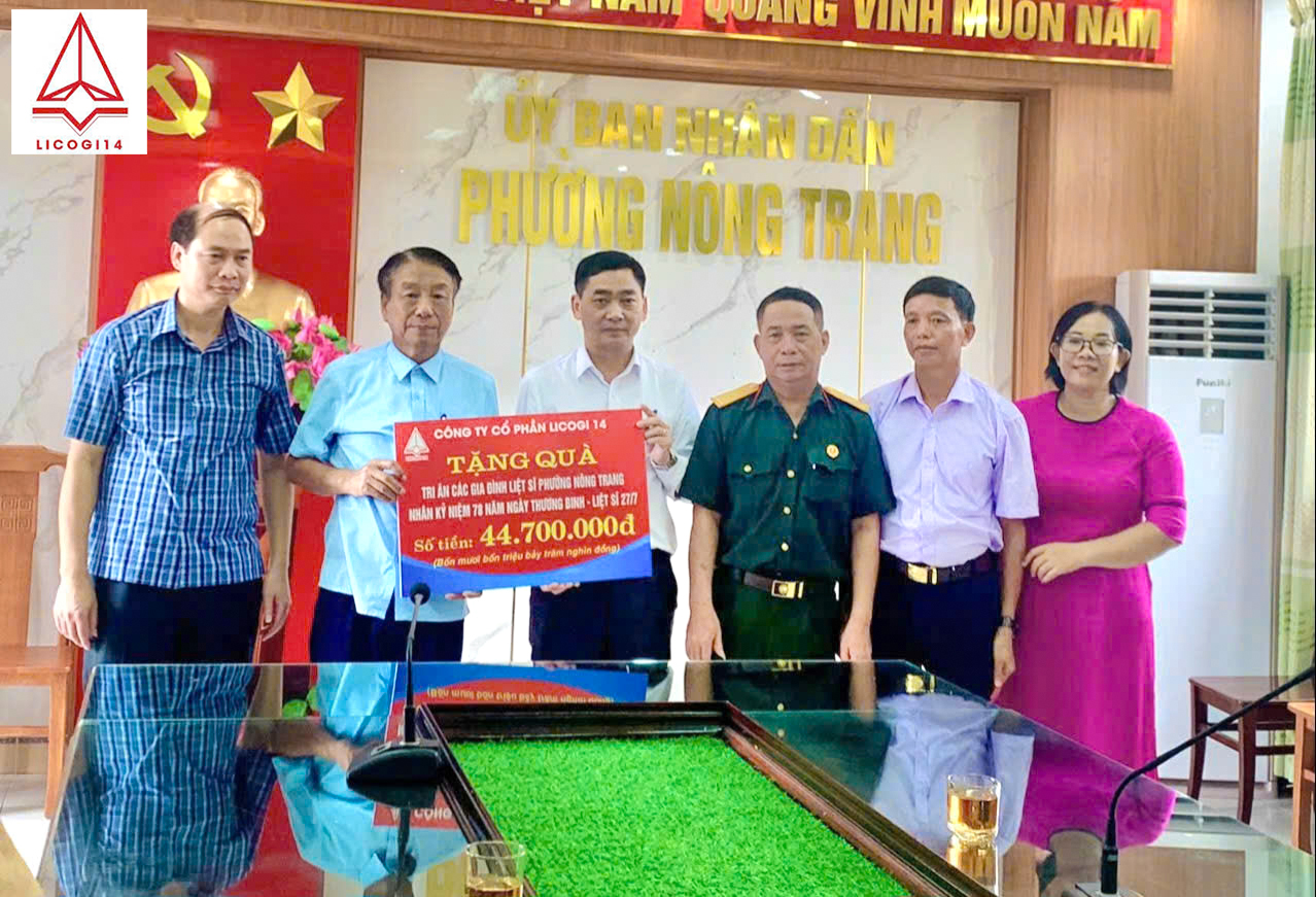 Với tinh thần "Đền ơn đáp nghĩa", LICOGI 14 đã tổ chức chuỗi hoạt động ý nghĩa tại Phú Thọ – mảnh đất giàu truyền thống cách mạng. Trong đó, 149 suất quà (tổng trị giá 44,7 triệu đồng) đã được trao tận tay các gia đình liệt sĩ trên địa bàn phường Nông Trang. Mỗi món quà dù vật chất không lớn, nhưng ẩn chứa tấm lòng thành kính của tập thể cán bộ, công nhân viên công ty.