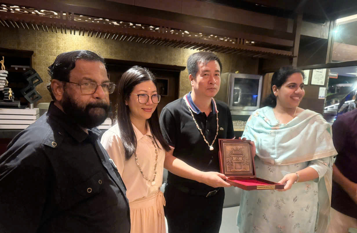 Đồng chí Phạm Hoài Phương, Chủ tịch Công đoàn Xây dựng Việt Nam tặng quà lưu niệm cho Bà Arya Rajendran, Thị trưởng Bang Kerala, Ấn Độ.