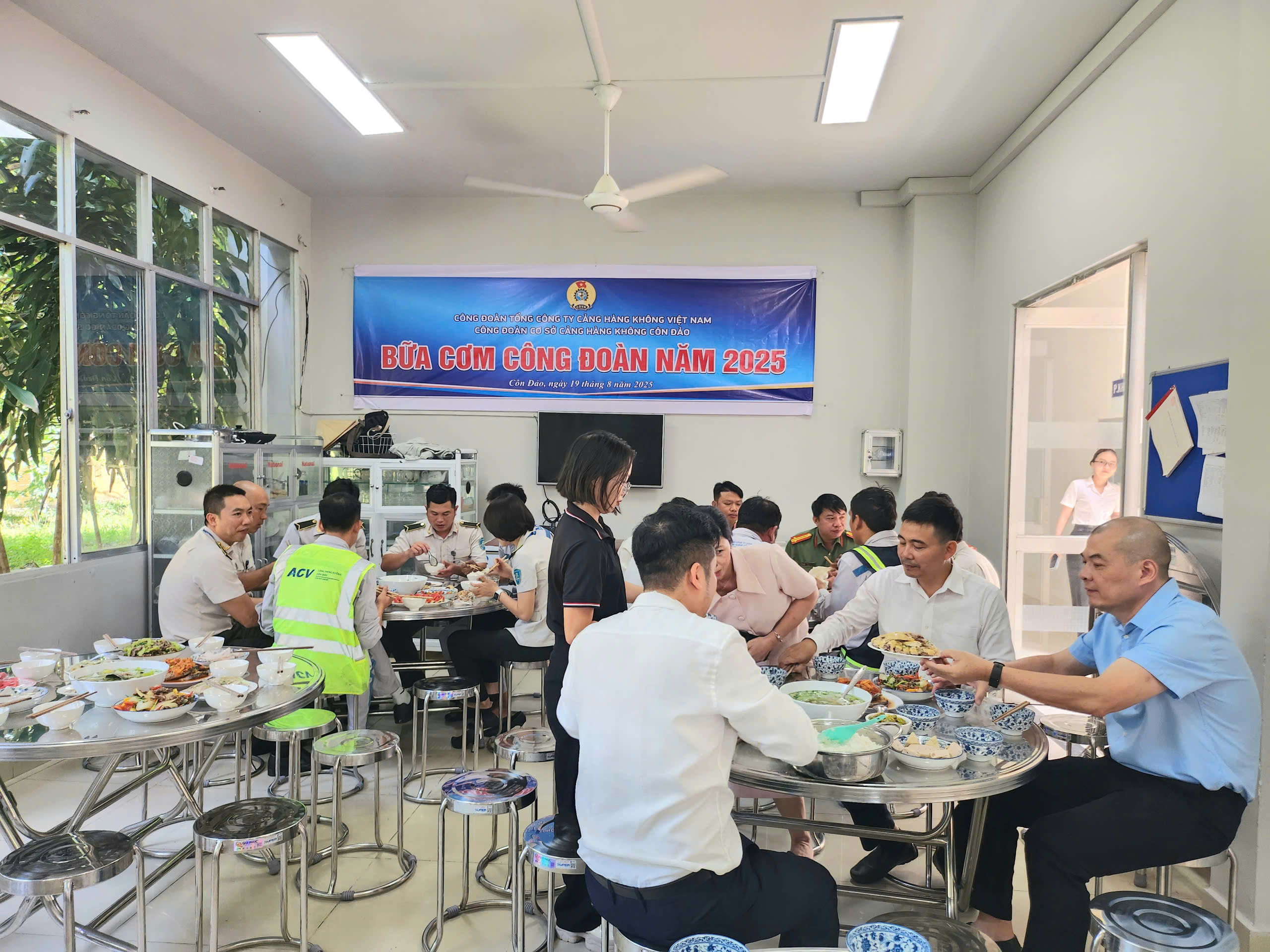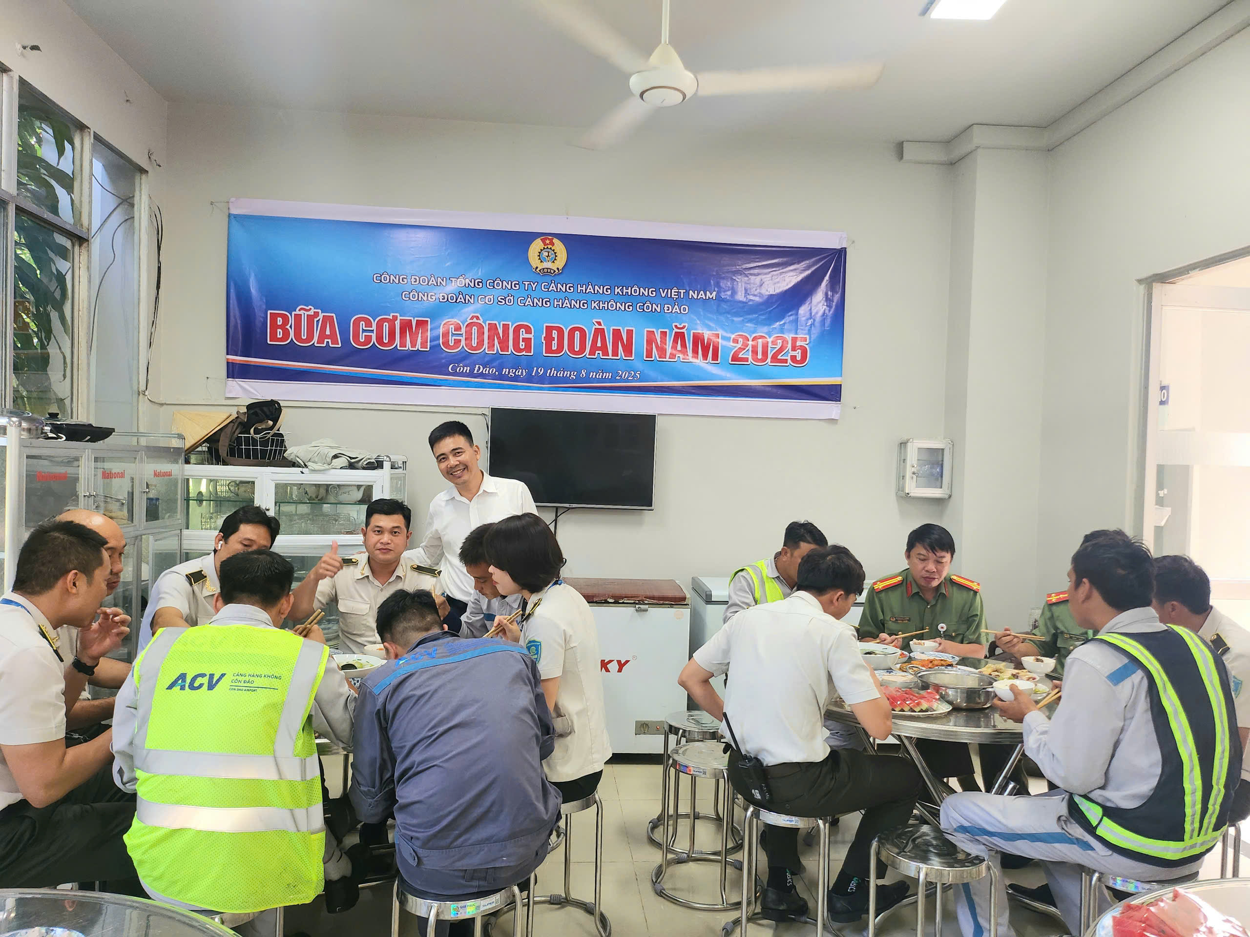 Tại Cảng hàng không Côn Đảo (19/8/2025): Vượt qua những khó khăn về khoảng cách địa lý, CĐCS Cảng HK Côn Đảo đã mang đến một bữa cơm sum vầy, ý nghĩa cho người lao động nơi tiền tiêu của Tổ quốc. Đây là nguồn động viên quý báu, giúp họ thêm yêu ngành, yêu nghề và vững tâm công tác.
