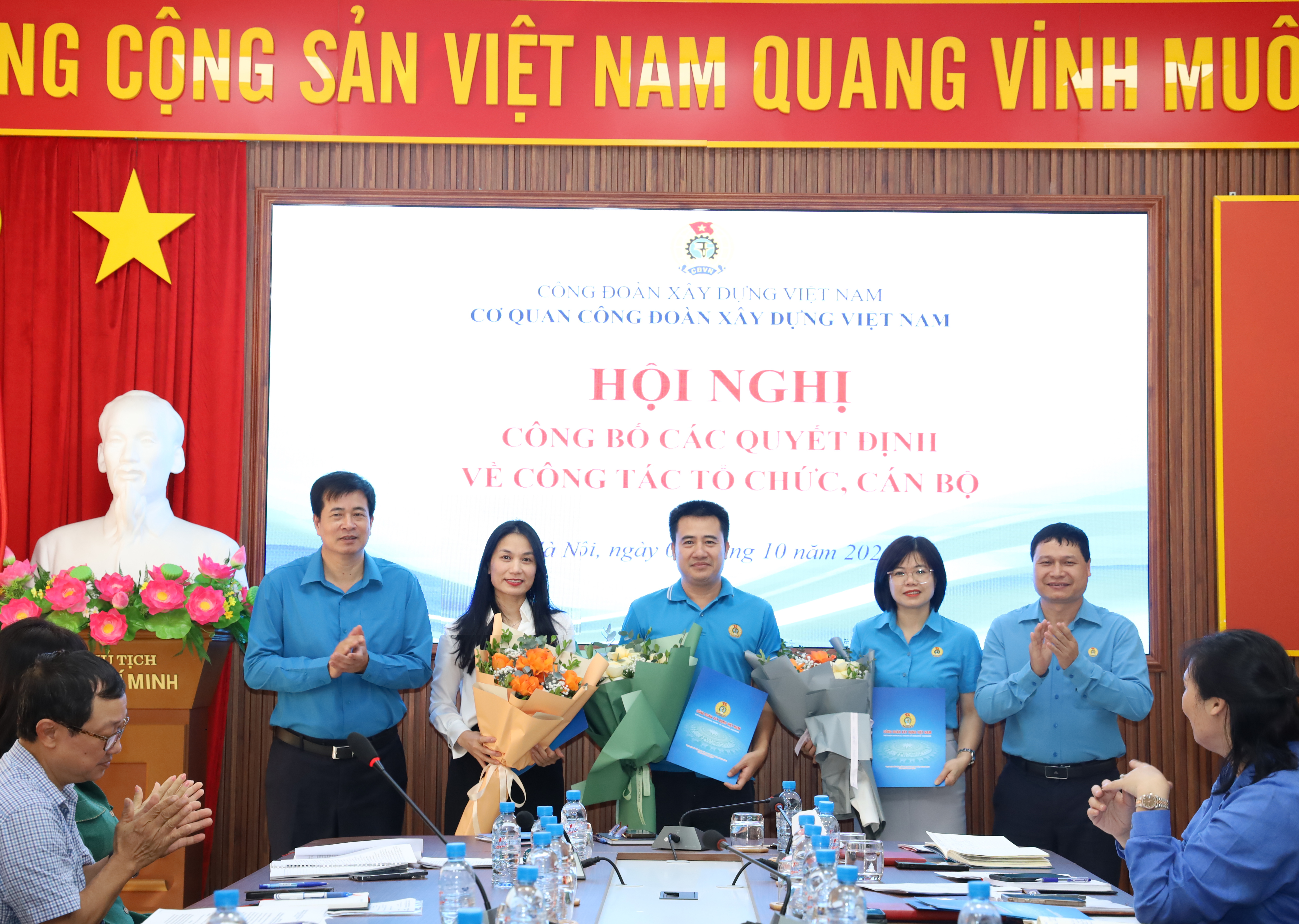 Đồng chí Phạm Hoài Phương, Chủ tịch Công đoàn Xây dựng Việt Nam trao Quyết định điều động và bổ nhiệm Trưởng Ban Công tác công đoàn, Kế toán trưởng Công đoàn Xây dựng Việt Nam và Trưởng Ban Quan hệ Lao động Công đoàn Xây dựng Việt Nam.
