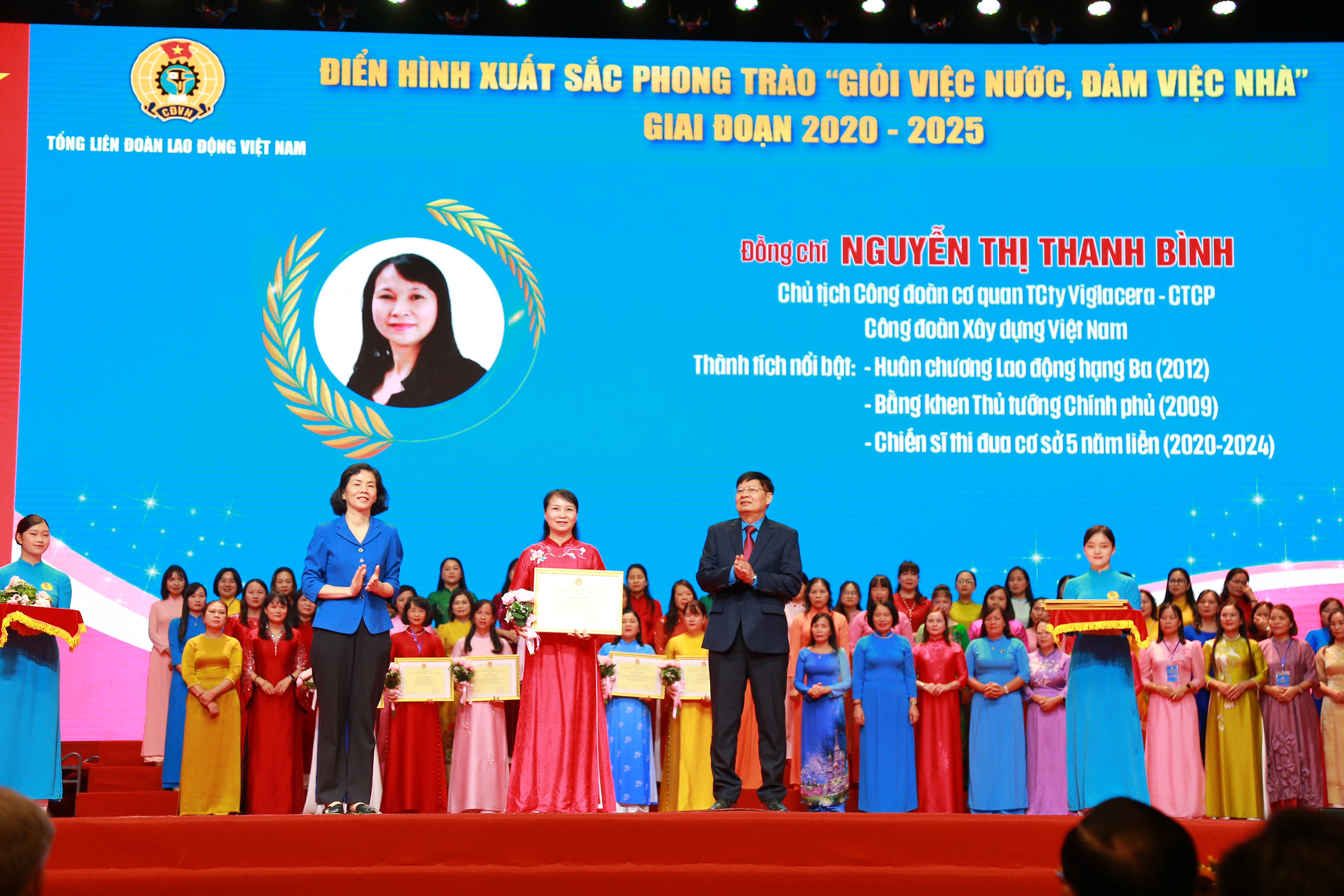 Tại buổi lễ, đồng chí Nguyễn Thị Thanh Bình, Chủ tịch Công đoàn cơ quan, Trưởng phòng Kiểm soát nội bộ, Tổng công ty Viglacera - CTCP, đã vinh dự là đại diện duy nhất của Công đoàn Xây dựng Việt Nam (CĐXDVN) được TLĐLĐVN trao tặng Bằng khen chuyên đề “Giỏi việc nước, Đảm việc nhà” giai đoạn 2020-2025.