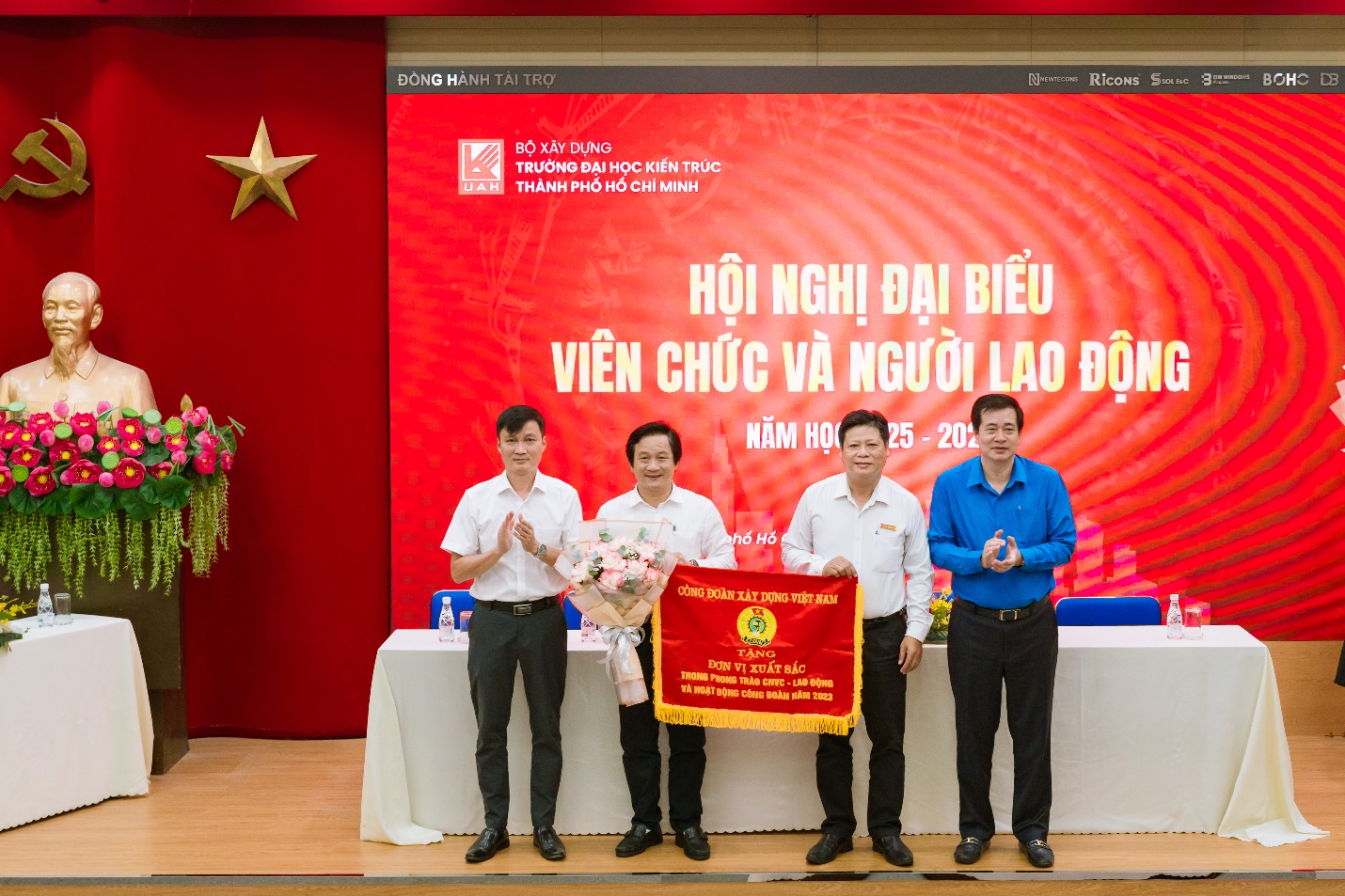 Đồng chí Phạm Hoài Phương, Chủ tịch Công đoàn Xây dựng Việt Nam trao tặng Cờ thi đua cho Ban Chấp hành Công đoàn Trường Đại học Kiến trúc Tp. Hồ Chí Minh.