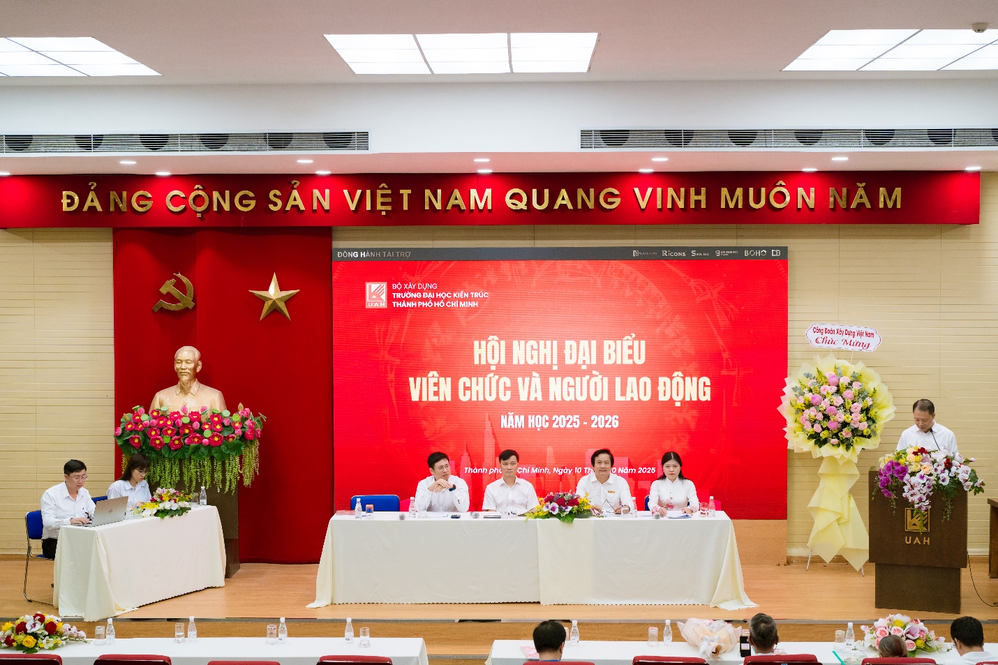 Ngày 10/10/2025, tại Hội trường A.106, Trường Đại học Kiến trúc Thành phố Hồ Chí Minh đã tổ chức thành công Hội nghị đại biểu viên chức và người lao động năm học 2025 - 2026. Đây là hoạt động thường niên quan trọng nhằm tổng kết quá trình thực hiện nhiệm vụ năm học trước, đồng thời thảo luận, đề ra phương hướng và các giải pháp trọng tâm cho năm học mới.