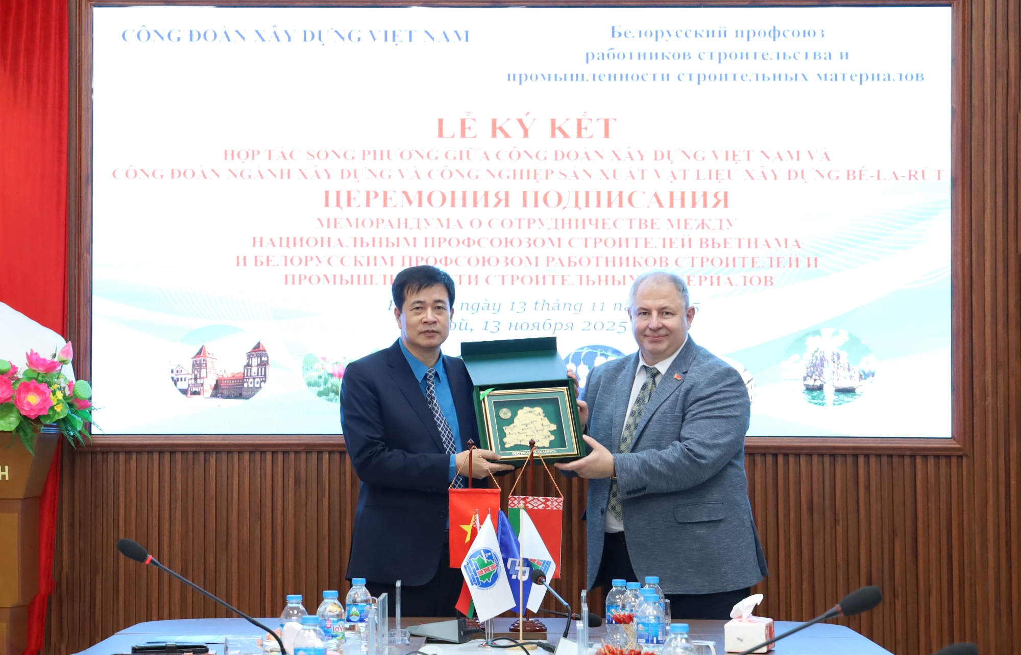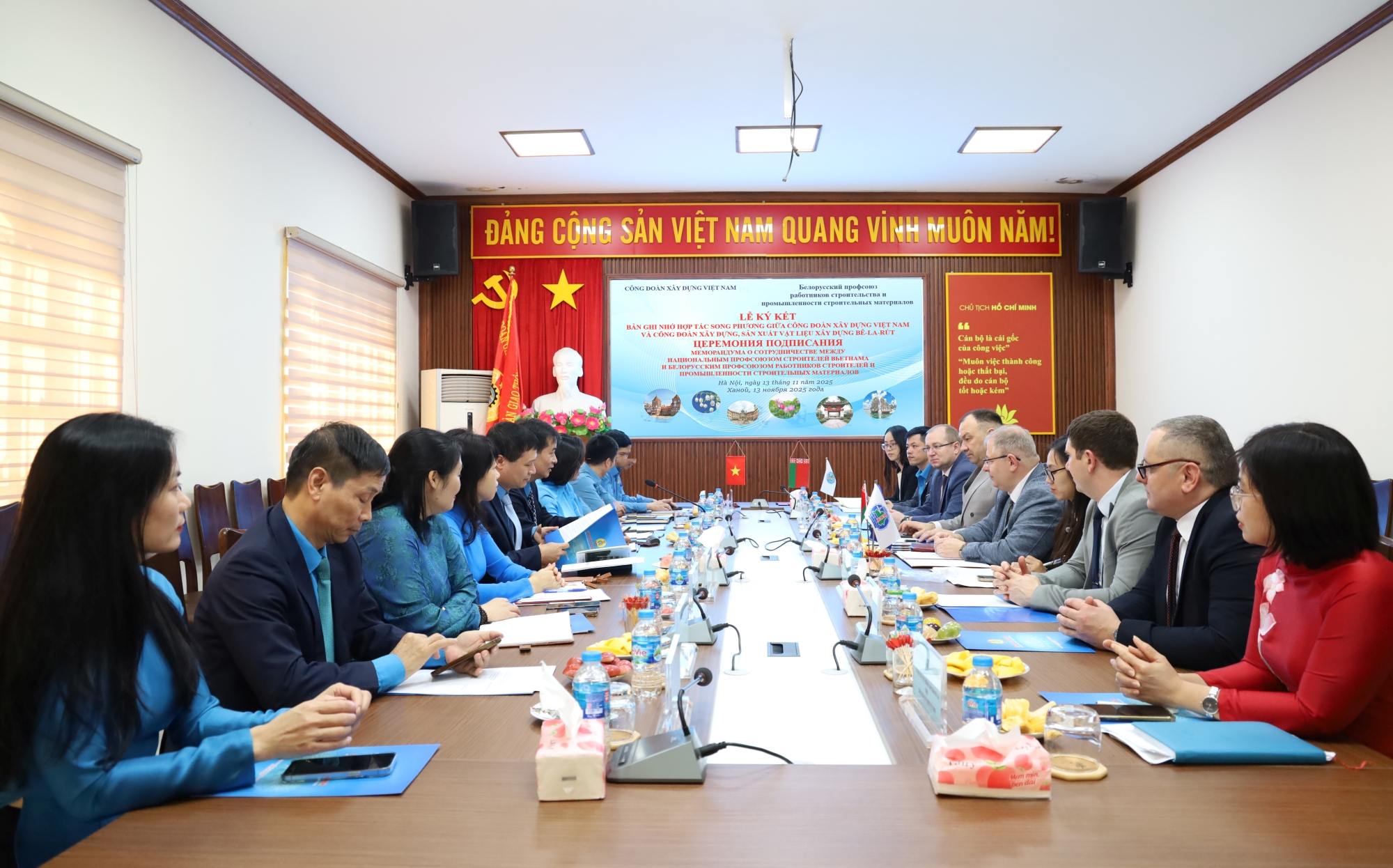 Ngày 13/11/2025, thực hiện Kế hoạch đối ngoại năm 2025 và được sự đồng ý của Tổng Liên đoàn Lao động Việt Nam, Công đoàn Xây dựng Việt Nam đã có buổi làm việc với Đoàn đại biểu Công đoàn Xây dựng và Công nghiệp sản xuất vật liệu xây dựng Bê-la-rút sang thăm, làm việc và ký kết Thỏa thuận hợp tác song phương.