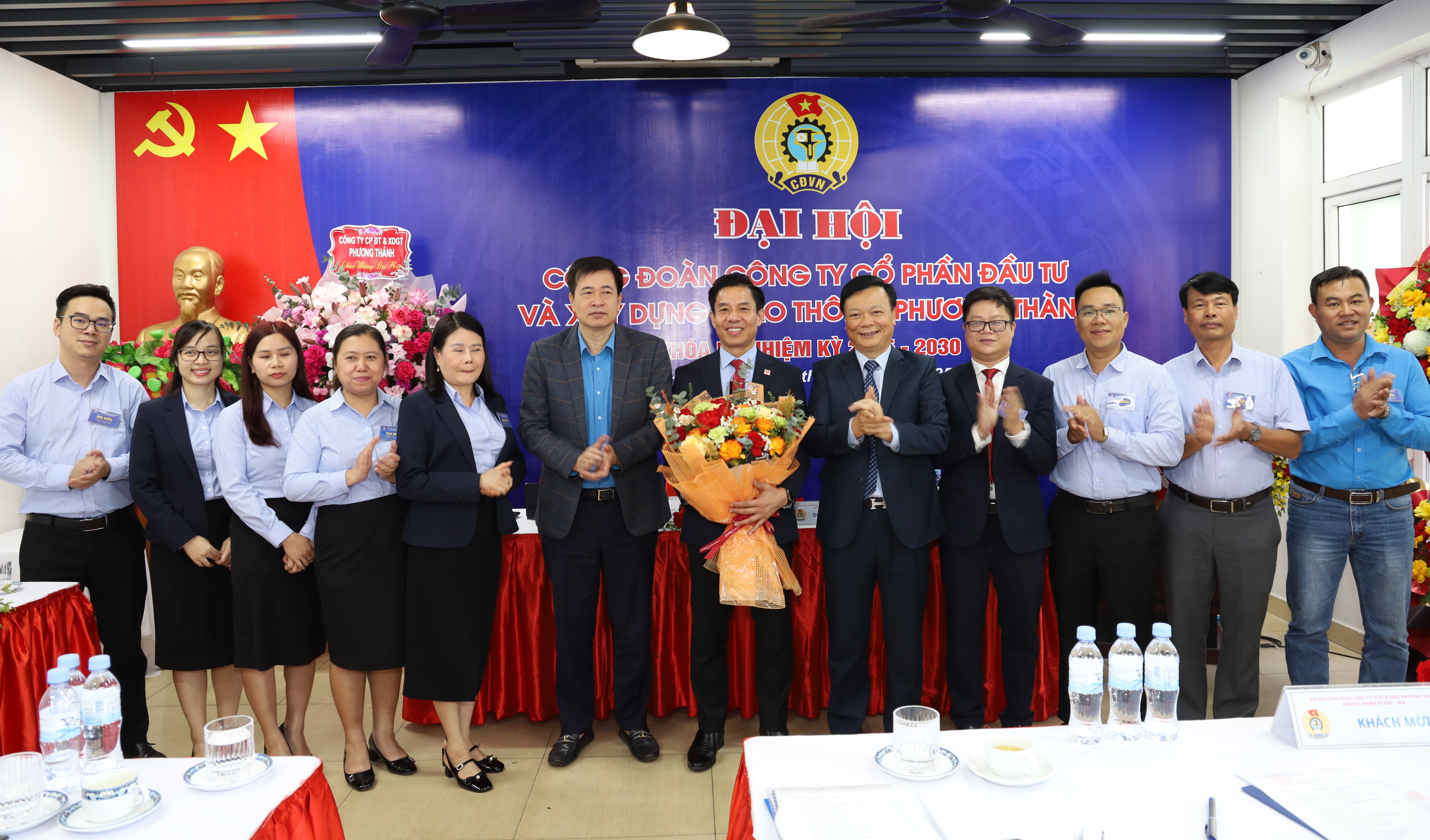 Chủ tịch Phạm Hoài Phương, Chủ tịch Công đoàn Xây dựng Việt Nam và đồng Phạm Văn Khôi, Bí thư Đảng ủy, Chủ tịch HĐQT, Tổng Giám đốc Công ty cổ phần Đầu tư và Xây dựng Giao thông Phương Thành tặng hoa BCH Công đoàn Công ty khóa IV, nhiệm kỳ 2025 – 2030
