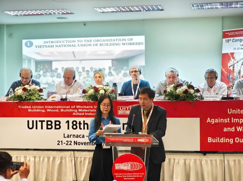 Trong hai ngày 21 - 22/11/2025, Đại hội Công đoàn Xây dựng, vật liệu xây dựng và gỗ quốc tế (UITBB) lần thứ 18, nhiệm kỳ 2025 - 2030 đã được tổ chức tại Cộng hòa Síp với khẩu hiệu hành động “Đoàn kết chống lại chủ nghĩa đế quốc và chiến tranh, xây dựng tương lai của chúng ta”.