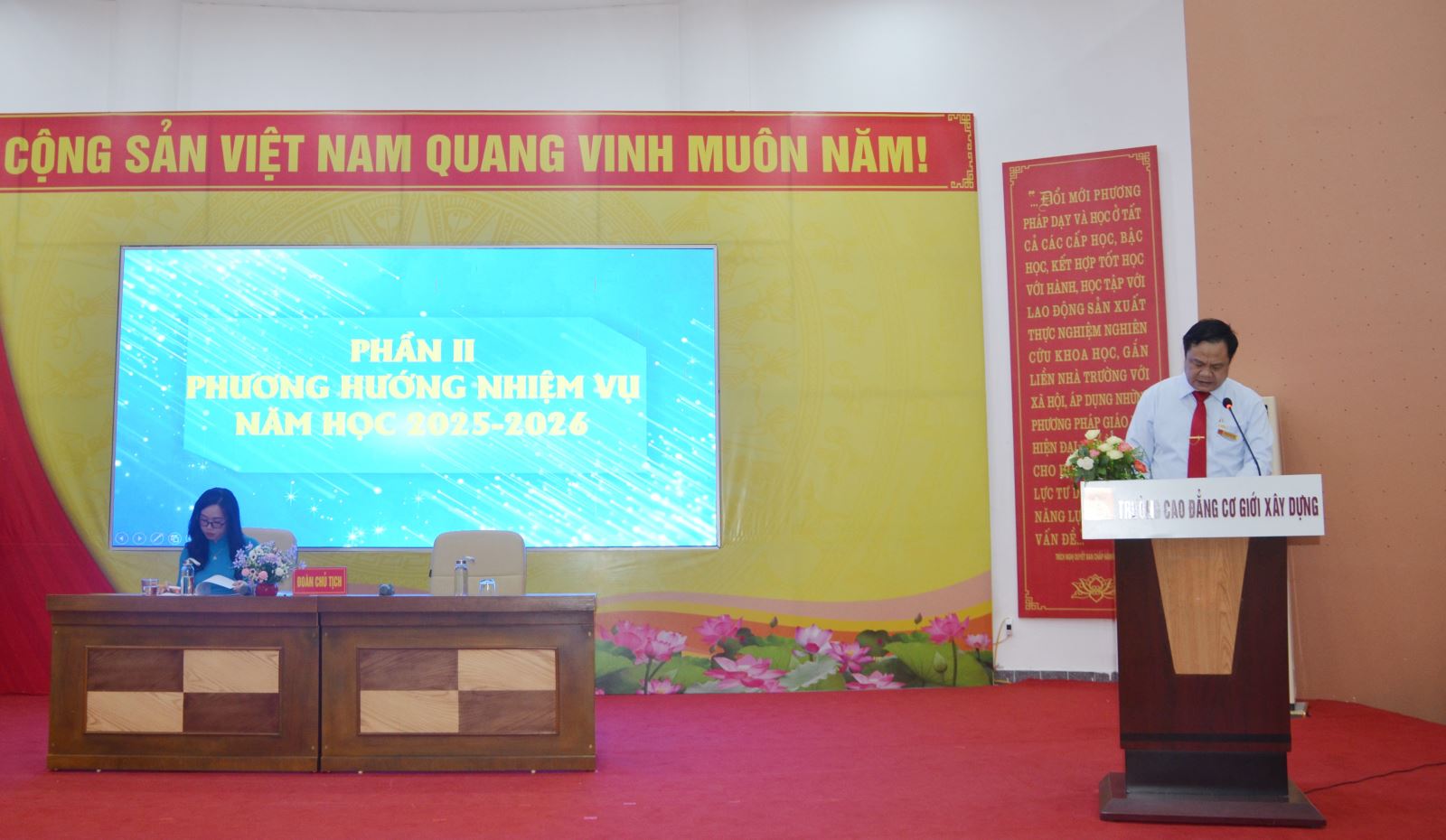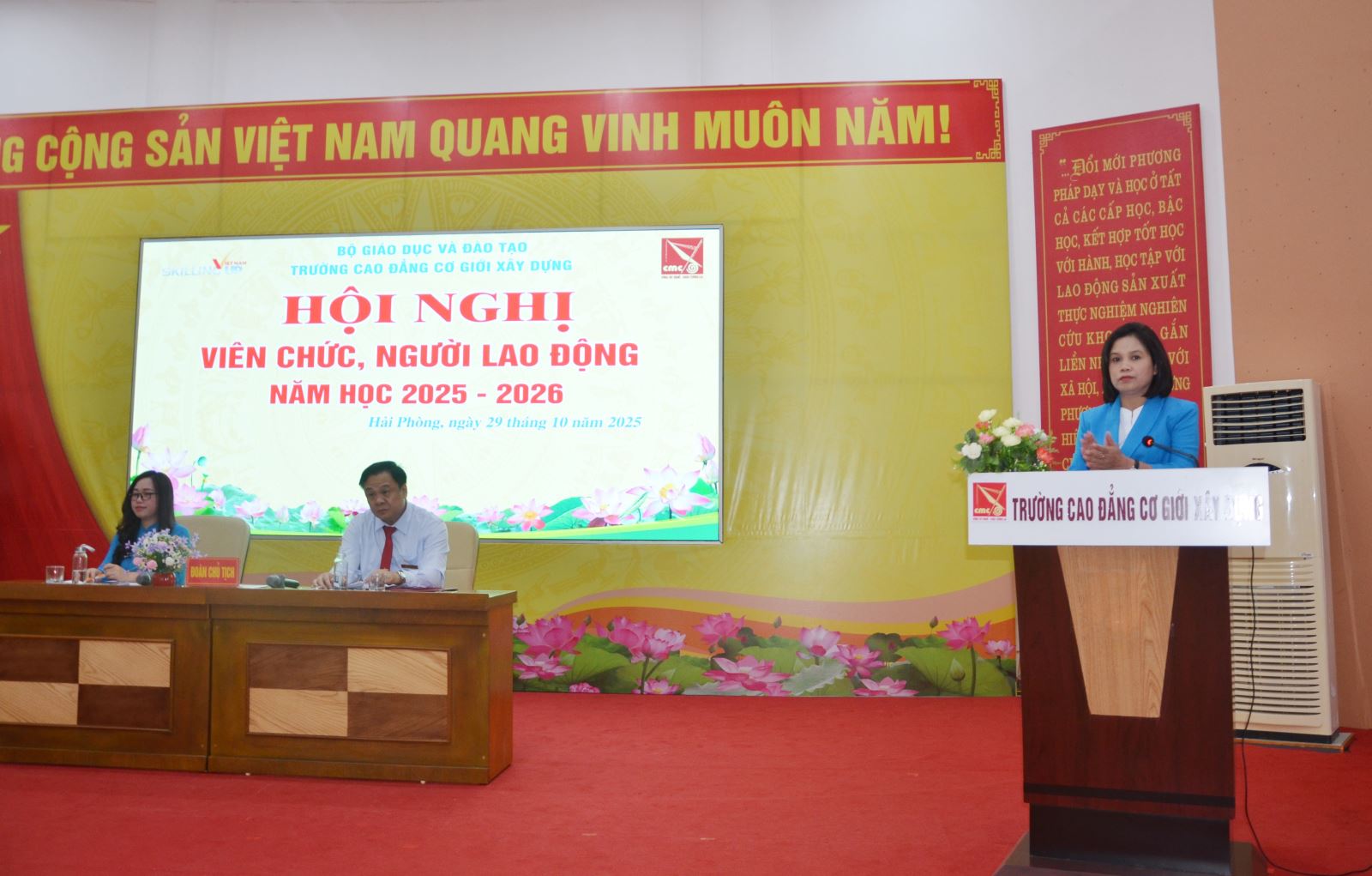 Phát biểu chỉ đạo Hội nghị, đồng chí Ân Thị Định - Phó Chủ tịch Công đoàn Xây dựng Việt Nam đã biểu dương sự nỗ lực cố gắng cùng những thành tích mà tập thể sư phạm Nhà trường đã đạt được trong năm học 2024-2025. Đồng thời, đồng chí cũng tin tưởng rằng với tinh thần đoàn kết, sáng tạo, đổi mới và thực hiện đồng bộ các giải pháp, tập thể sư phạm nhà trường sẽ hoàn thành xuất sắc nhiệm vụ năm học mới.