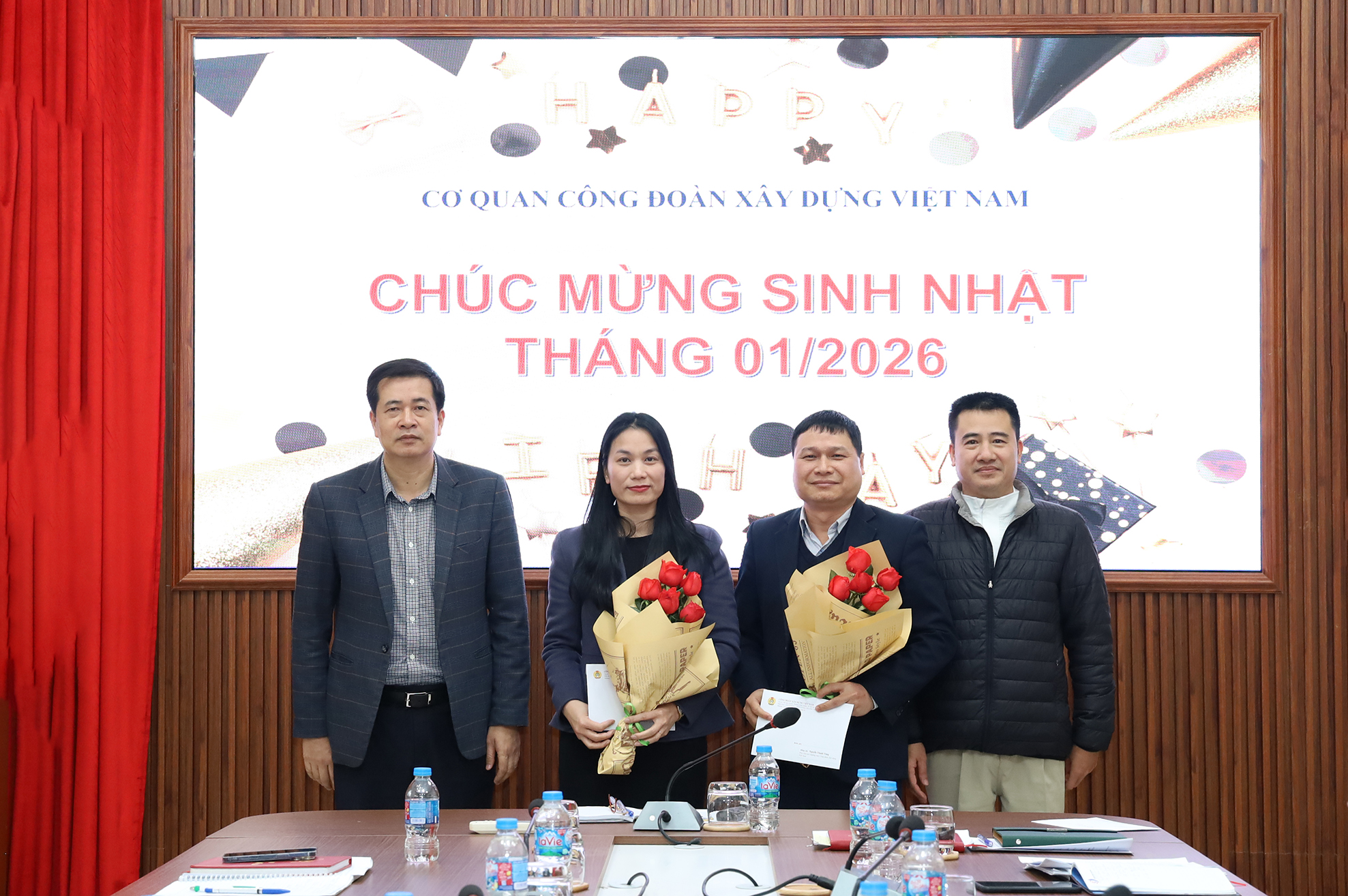 Đồng chí Phạm Hoài Phương, Chủ tịch Công đoàn Xây dựng Việt Nam, Thủ trưởng Cơ quan và đồng chí Lê Hồng Phong, Chủ tịch Công đoàn Cơ quan tặng hoa chúc mừng các đồng chí có ngày sinh nhật trong tháng 01/2026.